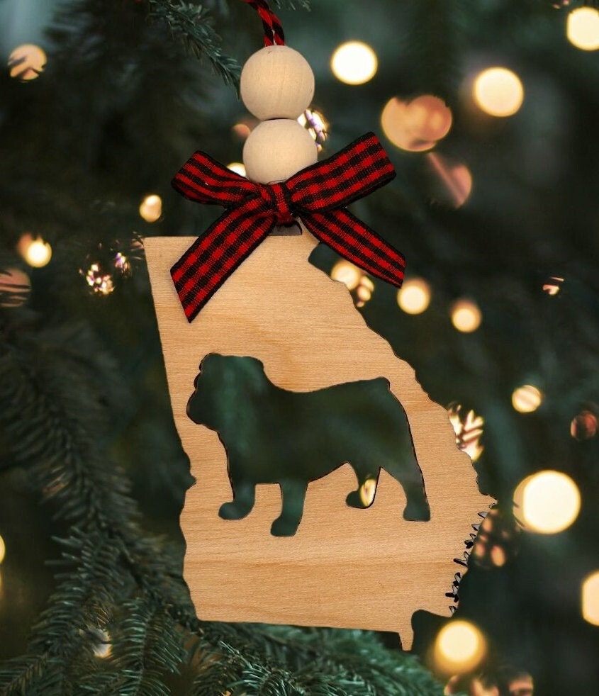 Each ornament is made from natural wood, cut into the shape of the state of Georgia, and features a detailed bulldog silhouette in the center. It's finished with a red-and-black plaid bow, natural wood beads, and a sturdy hanging cord—ready to display on your Christmas tree, hang on a garland, or tie to a gift.
