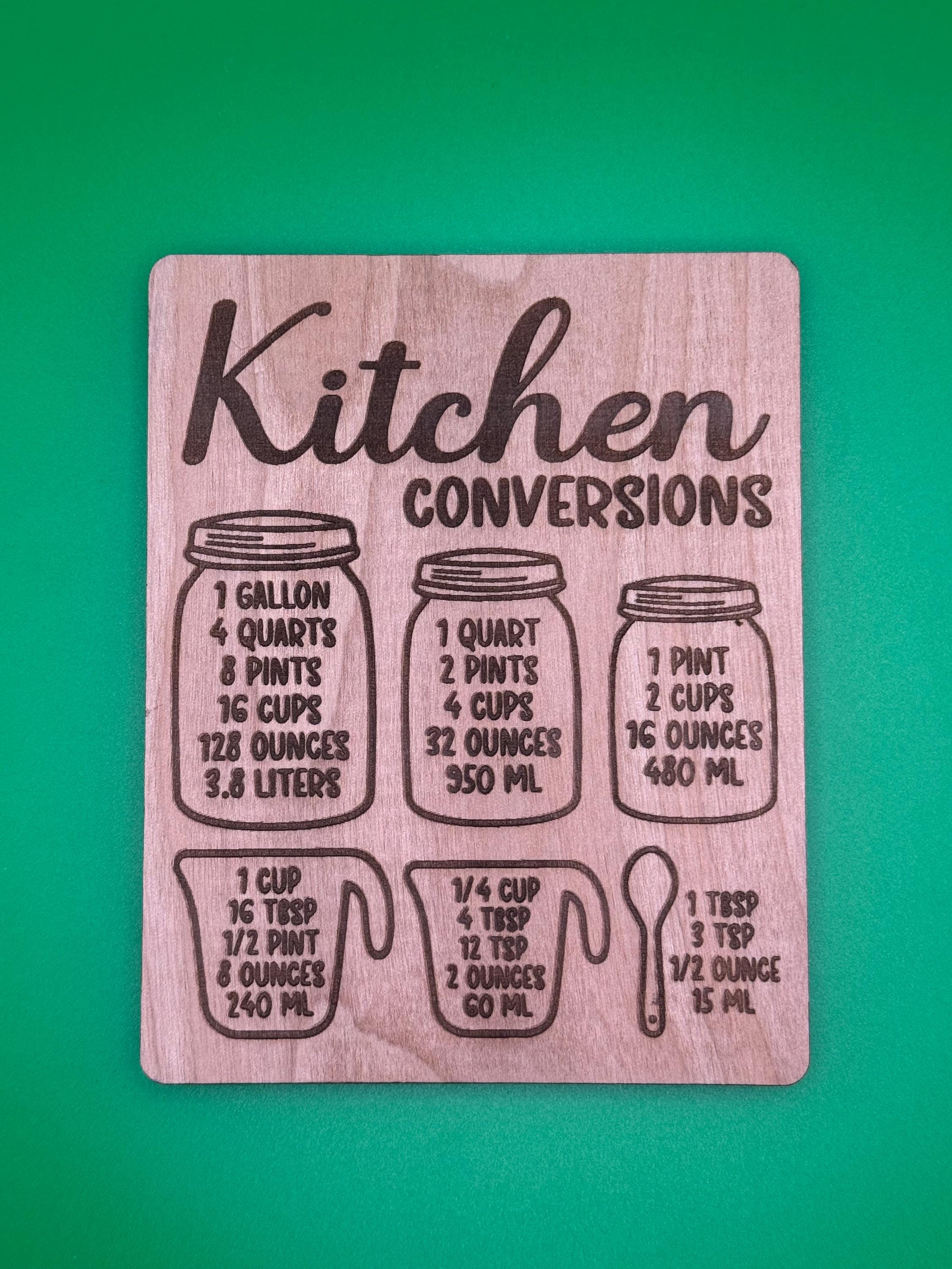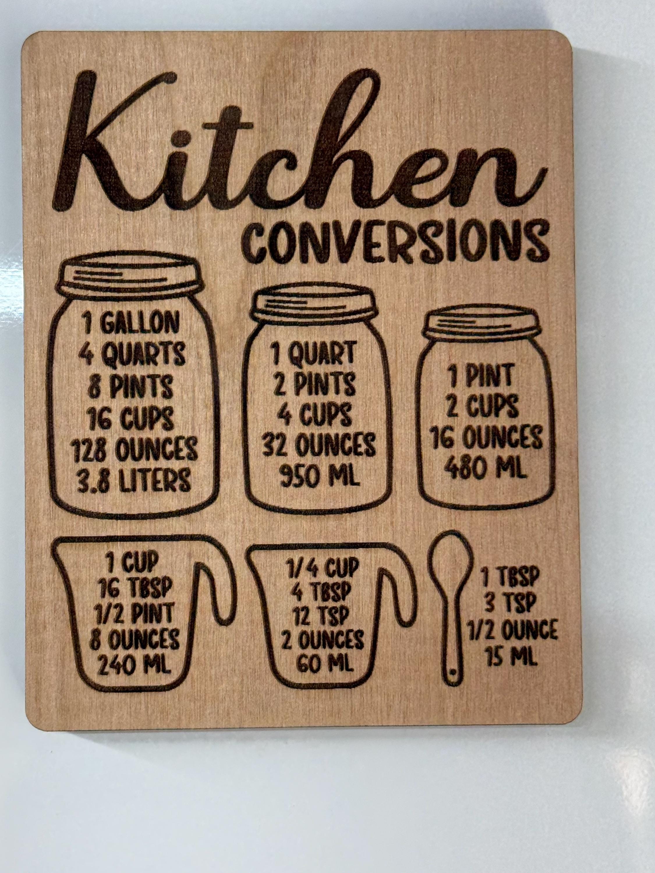 This beautifully engraved wooden magnet features essential cooking conversions, including gallons, quarts, pints, cups, tablespoons, teaspoons, ounces, and milliliters. Designed with charming mason jar and measuring cup illustrations, it's both functional and decorative.