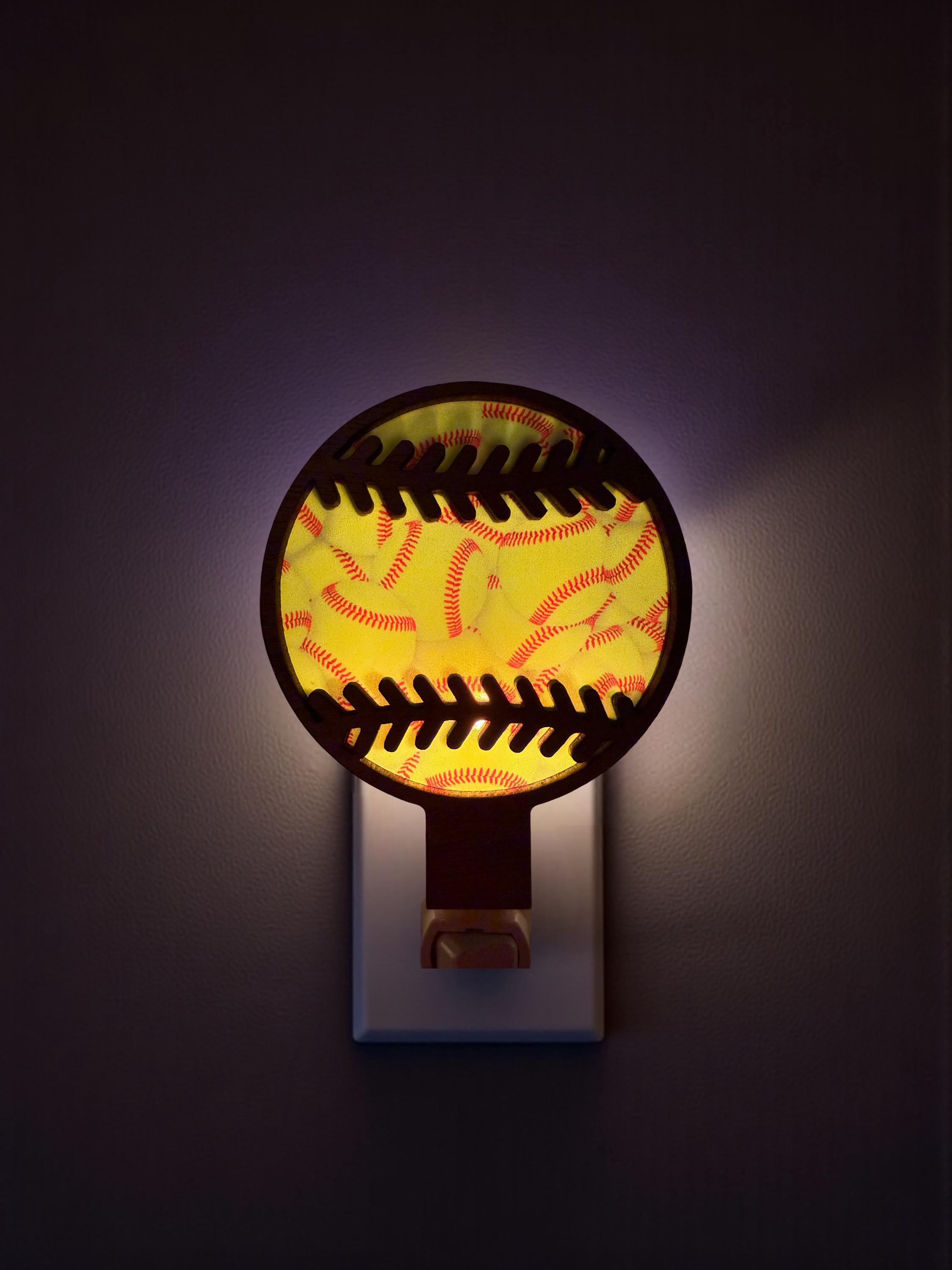 Softball night light plug in featuring a detailed laser cut softball design. Perfect sports decor, girls room night light, or softball lover gift.