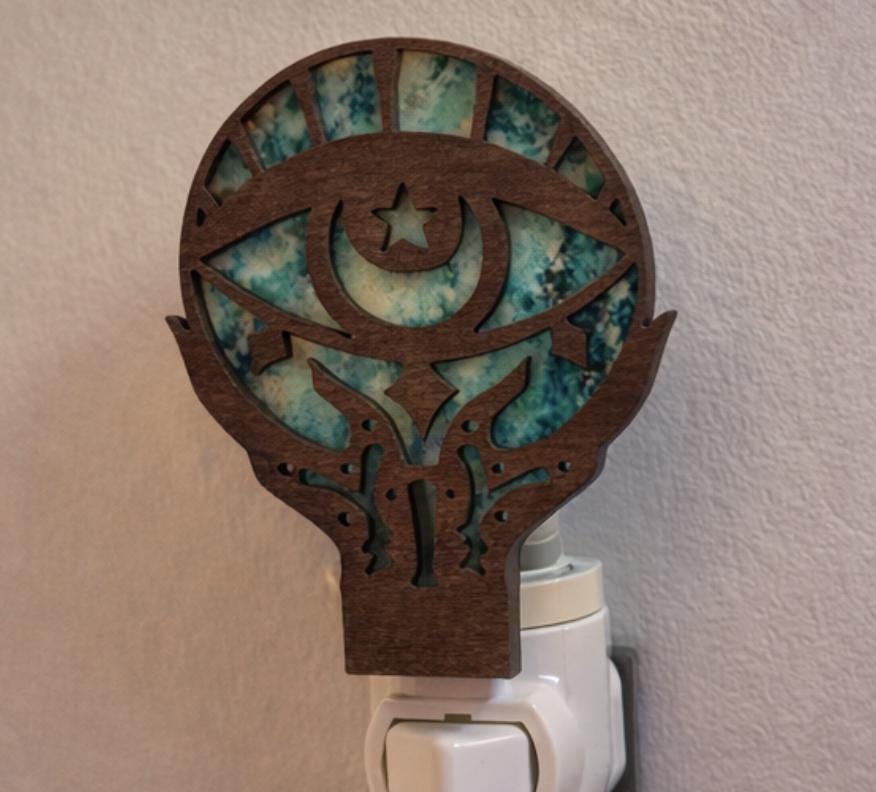 Bring calm, intention, and a warm glow into your space with this handcrafted Celestial Eye Night Light. Designed with layered wood and vibrant acrylic, this piece blends celestial symbolism with modern boho style for a striking yet soothing accent.