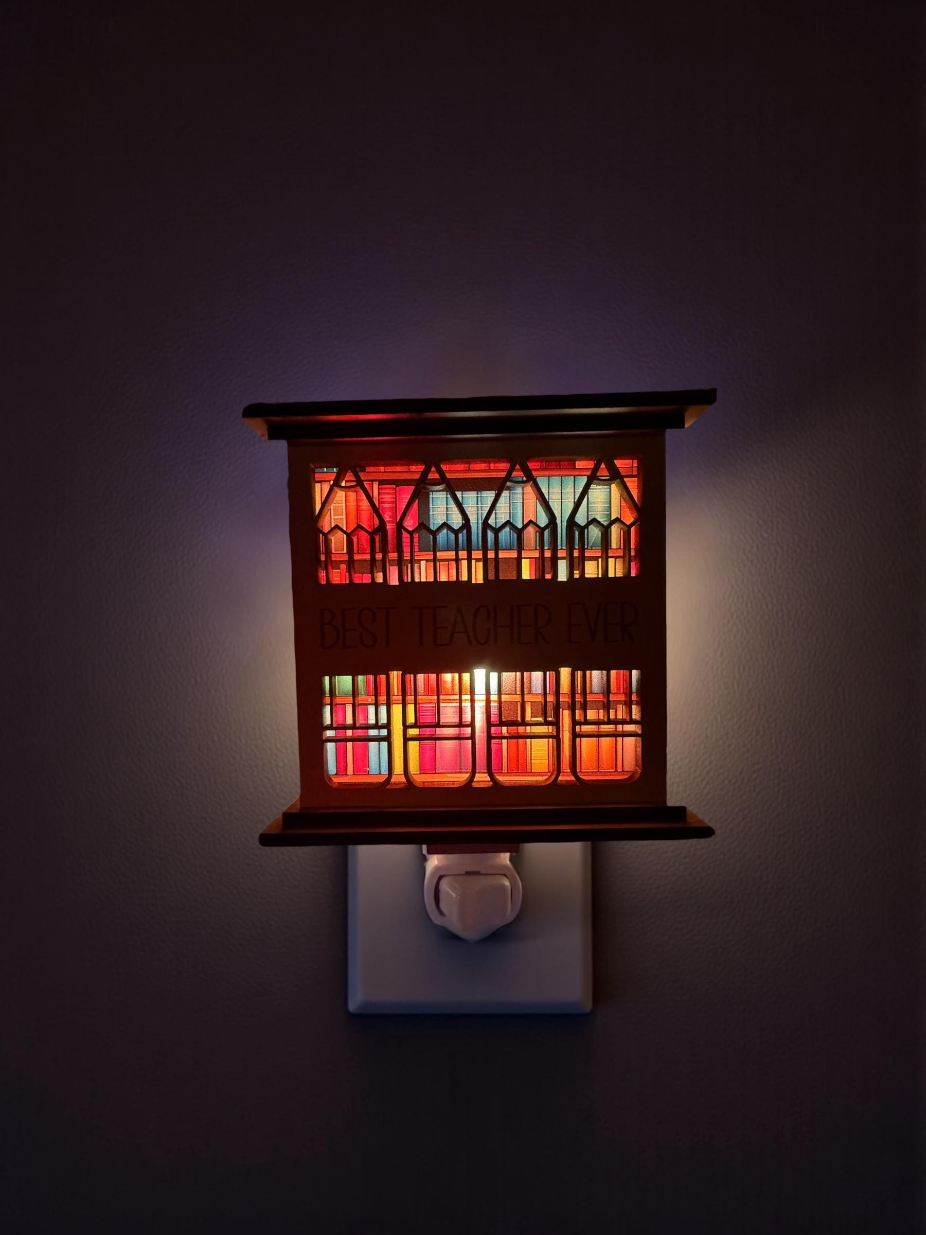 Celebrate an amazing teacher with this stunning 3D bookshelf night light, handcrafted from layered wood and acrylic for depth and glow.